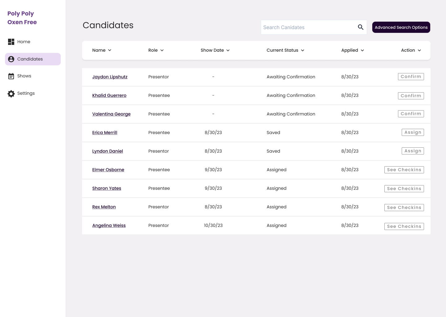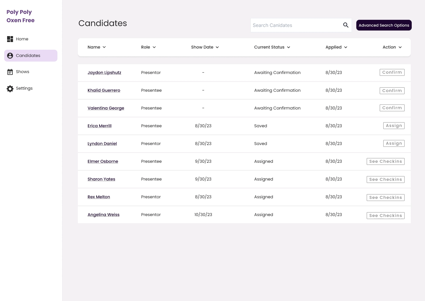 Poly Poly Oxen Free is a new live dating show in development by the creators of Tinder Disrupt, a popular live dating show held in the Bay Area, California. The client was a theater producer behind the new show who needed a new website for marketing the show as well as a design for a potential show candidate management system (to be used as a potential concept model for when the show later expands).