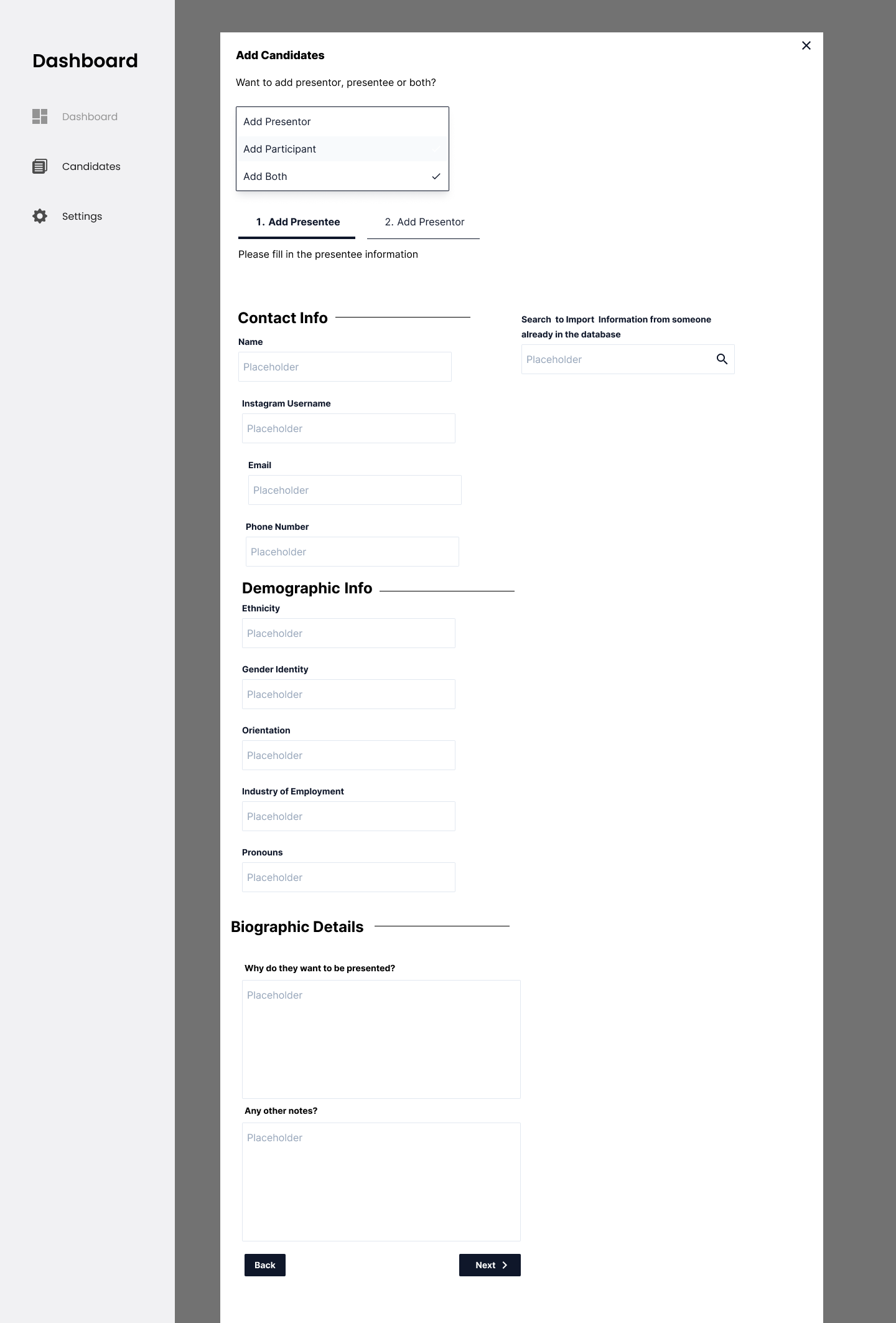 This flow allows the user to confirm the candidate for a specific show (assigning them to a slot in that show). The system would monitor the demographics of the shows and notify the user if a show had a bias towards any specific demographic. This was implemented due to the importance of diversity and representation in the show.