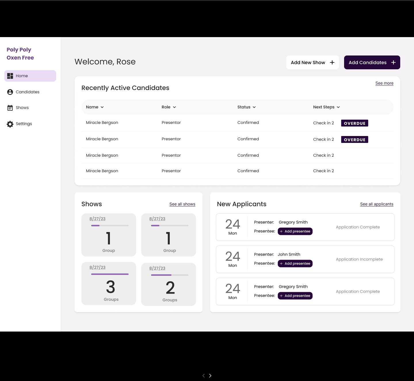 The dashboard is the most important of the high fidelity screens and was designed with best practices for dashboards in mind. It was created based on the interview data from the client where they stated that the most important things for them to know at a glance was the status of recent candidates, upcoming show composition (whether or not there were enough people assigned) and any new applicants. It puts the most important information (the status of recent candidates) for the client at the top.